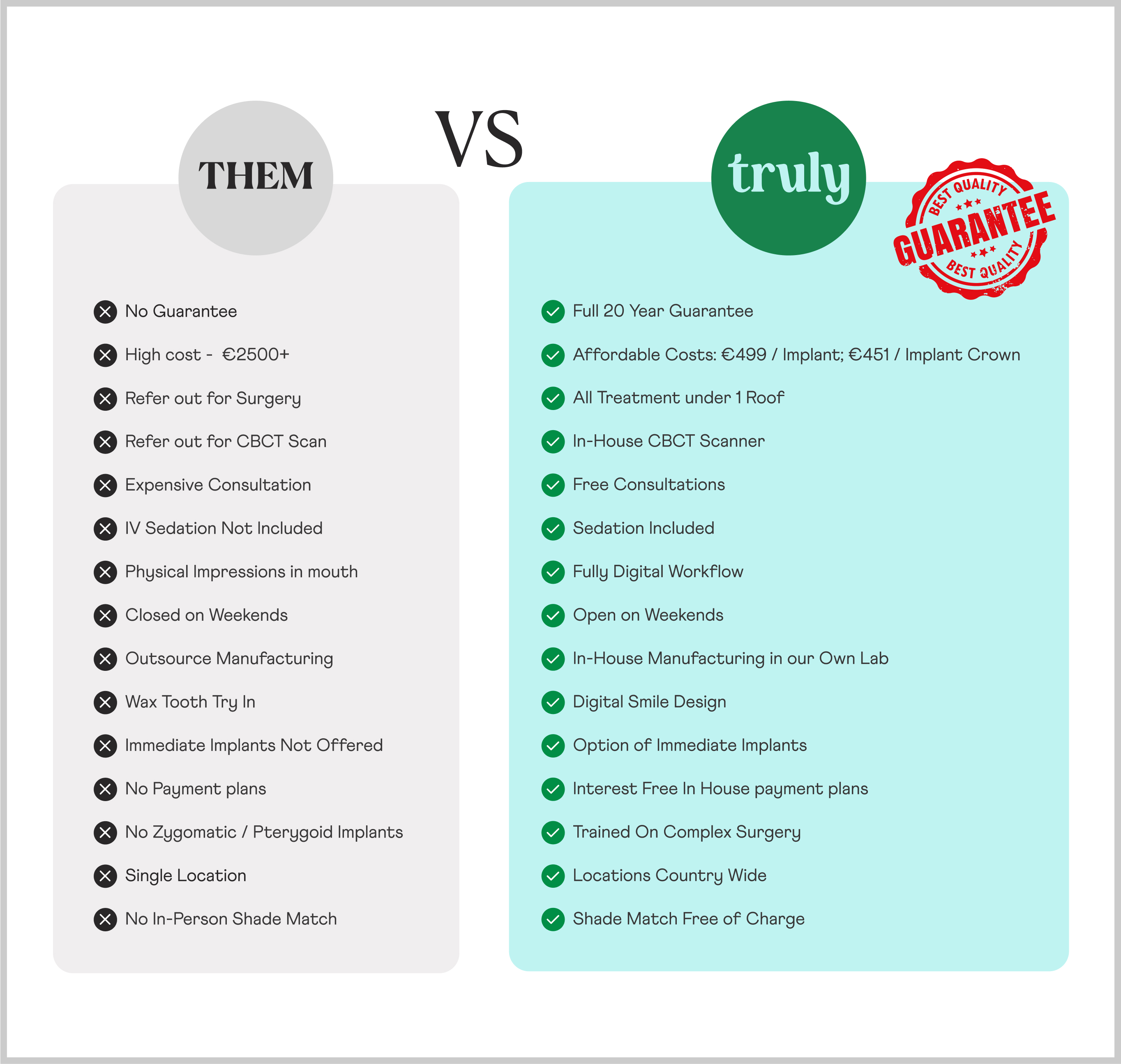 نحن فخورون بكوننا العيادة الوحيدة في أيرلندا التي تقدم ضماناً كاملاً لمدة 20 عاماً على غالبية عمليات الزرع، لذا إذا واجهت أي مشاكل في أسنانك قبل ذلك الوقت، يسعدنا تقييمها وترميمها دون أي رسوم إضافية أثناء خضوعها للضمان. يمكنك أن تثق بنا لنقدم لك علاجاً فائقاً وطويل الأمد وفعالاً من حيث التكلفة ويتم تقديمه على أعلى مستوى ممكن.